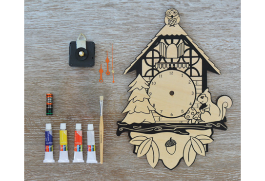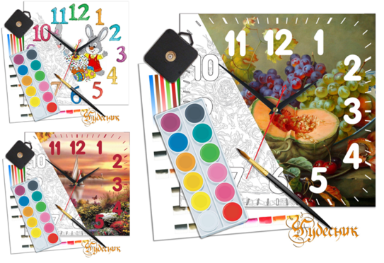 Фанера с подставкой и нанесенной основой для росписи, механизм, стрелки и краски с кисточкой