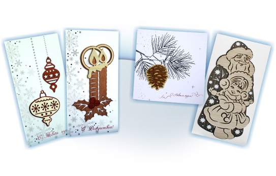 Стильные дизайнерские открытки из шпона и картона. Есть различные сюжеты и дизайна на различные прадники и события